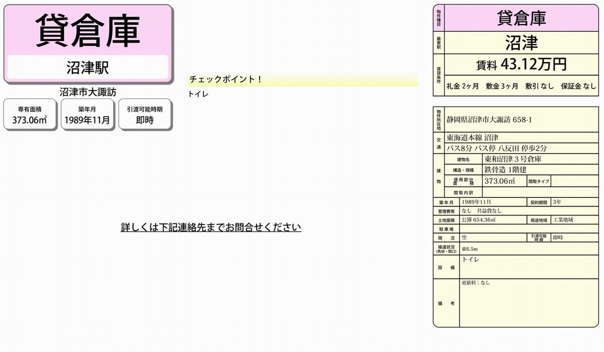 沼津市大諏訪658-1 (沼津) 東和沼津3号倉庫 詳細データ
