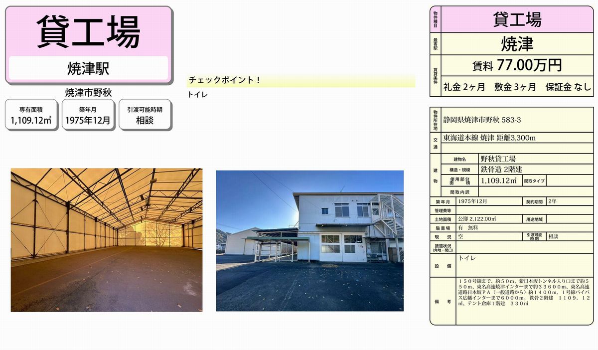 焼津市野秋583-3(静岡県)の貸倉庫・貸工場・貸地をはじめ静岡全域の貸し倉庫・貸し工場・貸し土地を検索できます。焼津市野秋583-3(静岡県)の事務所付貸倉庫、クレーン付工場、店舗倉庫、工業専用地域等、ニーズに合わせて簡単検索。焼津市野秋583-3(静岡県)の貸し倉庫・貸し工場・貸地を貸したい方にはオーナーサポートシステムで無料にて査定・掲載いたします。焼津市野秋583-3(静岡県)で貸倉庫・貸工場・貸し土地をご契約のテナント様には貸し倉庫・貸し工場の設計変更、造作のご相談・施工も承ります。貸倉庫・貸工場・貸地で移転・新規開設をするなら静岡地区最大級のテナント.com! |