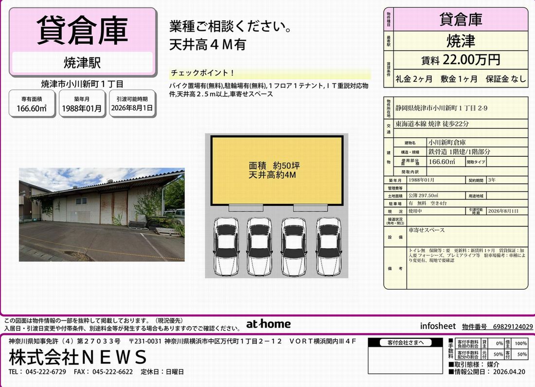 坪数500坪、賃料132万円の大型倉庫が藤枝市に出ました。バイパス乗り場目の前で、東名高速までアクセス良好です。お問合せお待ちしております。